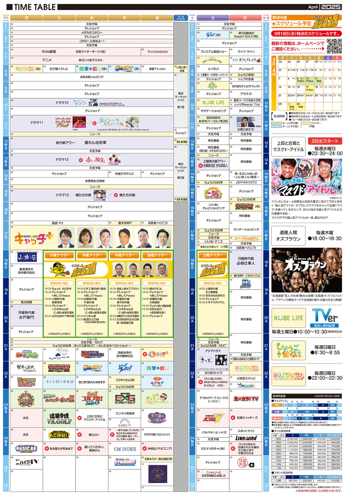 タイムテーブルをご希望の方は、110円切手を貼った返信用封筒[長型3号](1部の場合)に、住所、氏名、郵便番号をご明記のうえ、下記宛先までお送りください。 (複数お送りする場合は切手のお値段が変わりますのでお問い合わせください) ※毎月25日頃発行。数に限りがございますので、終了の場合はご了承ください。 〒650-8536 サンテレビ タイムテーブル希望係