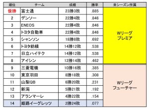 Wリーグは来シーズン(10月開幕)から2部制となり、今シーズンの上位8チームが「Wリーグ プレミア」に、9位以下の6チームが「Wリーグ フューチャー」に振り分けられた。
