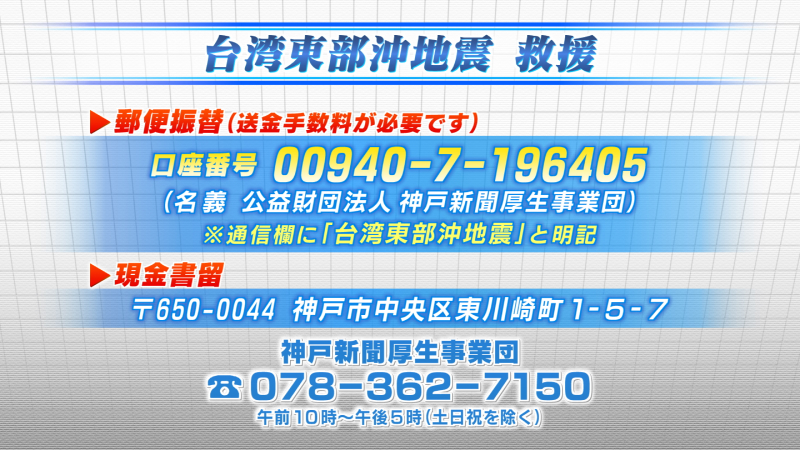 救援募金のお知らせです。 サンテレビジョンと神戸新聞厚生事業団、神戸新聞社、ラジオ関西は、 台湾東部沖地震の被災者救援のため、義援金を4月8日から6月25日まで受け付けています。 義援金は、郵便振替か現金書留で。物資の取り扱いは致しません。 皆様のご協力をお願いします。