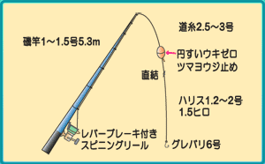 和歌山県串本町出雲の磯でグレを狙う。出雲では釣りに適した磯が20箇所あるが、今回の取材では「ジンヨモのカベ」に上がらせてもらった。エサはボイルしたオキアミを使い、30cm超えの口太に25cm前後の尾長が各5匹をゲットした。3月後半には40cmの大物が期待できるとのこと。