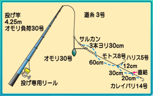 レインボーキャスターズのメンバーが明石一文字で投げ釣り。取材した当日は例年よりも水温が低く苦戦したが、朝から夕方まで粘ってアイナメ、カレイをあげた。今は徐々に水温が上がりだし、これから大きいもので40cmほどのカレイ、メバル、ガシラが期待できるという。