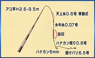 「これは絶対に行かねばならぬ」と安田明彦がリポート・アングラーの東山希美代を連れて、まだ暗い内から気合十分に臨む。長竿にオトリのアユを付けて誘う友釣り。