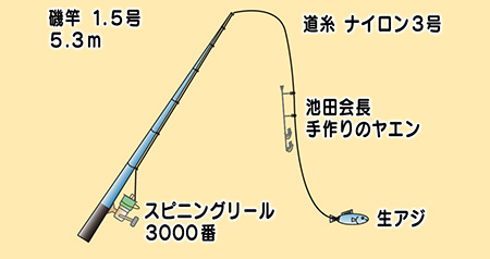 産卵期で磯の藻場に近づくアオリイカを釣ろうと衣奈の黒島本島に上がったのは、池田会長と息子の翔弥さん、吉田和也さん、澤田直也さんの4人。それぞれのポイントで準備を済ますと爆釣を願って早速アジを結んだ仕掛けの竿を出します。池田さんたちは、アジを捕食するアオリイカをヤエンという掛け針で釣り上げる「ヤエン釣り」を楽しんでいて、ヤエンは池田会長が長年研究と修正を施しながら自ら作り上げたものを使用します。今年はアオリイカの個体数が少なく、4月の台風1号の影響で産卵場所となる水中のホンダワラが流されるなど、状況的に厳しいことが予想されていて一抹の不安を抱えながらの釣行となりました。夜明け前から竿を出しますがアタリすらなくボウズも頭をよぎった夕方近く、メンバーの竿がしなり糸が出され大物の予感を抱かすアタリが出ます。慎重にやり取りをしギャフに掛けたアオリイカの重量は如何に・・・