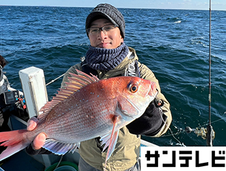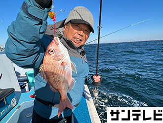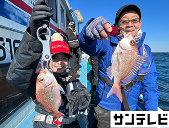 オール阪神さんと番組アドバイザーの今井浩次さん、ゲストの三石忍さんはひとつテンヤチーム。吉本美咲アナウンサーとオーナーばりスタッフの大東哲也さんはタイラバでビッグサイズのマダイを狙います。ファーストヒットはひとつテンヤチームの三石さんでしゃくりとフォールを繰り返す途中でマダイを釣り上げました。続いてタイラバチームの吉本アナがネクタイを変えたとたんにアタリが出てナイスサイズのマダイをGET。その後はタングステンのひとつテンヤに変えた今井さんとネクタイのカラーにこだわった大東さんもマダイを釣り上げます。そして千両役者の阪神さんもPEを細くしてテンヤをタングステンに変えてマダイを釣り上げ船中全員安打で満足の釣行となりました。