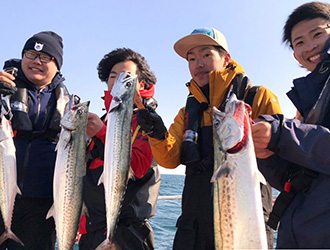 到着後の1投目で初心者の大谷さん、城さんにヒットし、ベテランの亀谷さんもサワラを釣り上げます。ブレードジギングの回数が少ない小牟田さんは、亀谷さんからの指示で巻のスピードや狙い棚を見極めて無事サワラをGETして、船中全員安打を達成し笑顔で竿を収めました。
