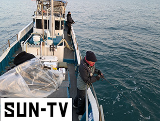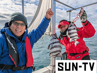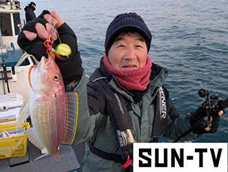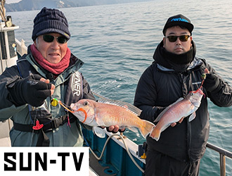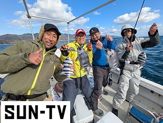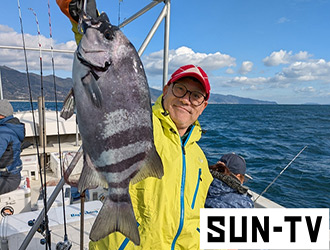年始最初のロケは恒例となっているオール阪神さんとチームジグフィットの皆さんとのイシダイ狙い。今年も兵庫・沼島沖で狙うため土生港から出船。ここ3年ほど釣果が無い阪神さんはいつもの釣り座を嫌いますが、あえてエサを巻き続ける船長の後ろの釣り座を初志貫徹で選びます。朝一は青物モーニングで幕が開きますが、それ以来ぱたりとアタリが止まります。そんななか阪神さんの竿が大きくしなりイシダイ特有のアタリでしたがハリスごと切られてばらしてしまいます。それが合図となったのか船中でサンバソウラッシュ!ダブルヒット・トリプルヒットも飛び出してお祭り騒ぎ。極めつけは阪神さんが42cmのイシダイを釣り上げて皆さん大はしゃぎとなり大満足の釣行となりました。