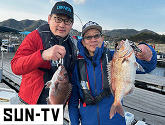 桜の花が咲くには少し早いですが産卵前の荒食いのマダイを狙おうと、白浜椿港を訪れた阪神さんと近藤さんですがあいにくの雨が降り続きます。そのうえ上潮が速く底潮が動かない2枚潮でマキエが溜まる釣りにくい状況でしたが、近藤さんが1投目からナイスサイズのマダイを釣り上げて上々のスタートを切ります。その後阪神さんにもアタリが来ますが釣り上げたマダイはなんと半身でサメにかじられてしまいます。その後はラッシュも無くポツリポツリの拾い釣りとなりましたが、阪神さんがナイスサイズを釣り上げて笑顔の納竿となりました。