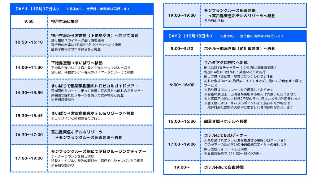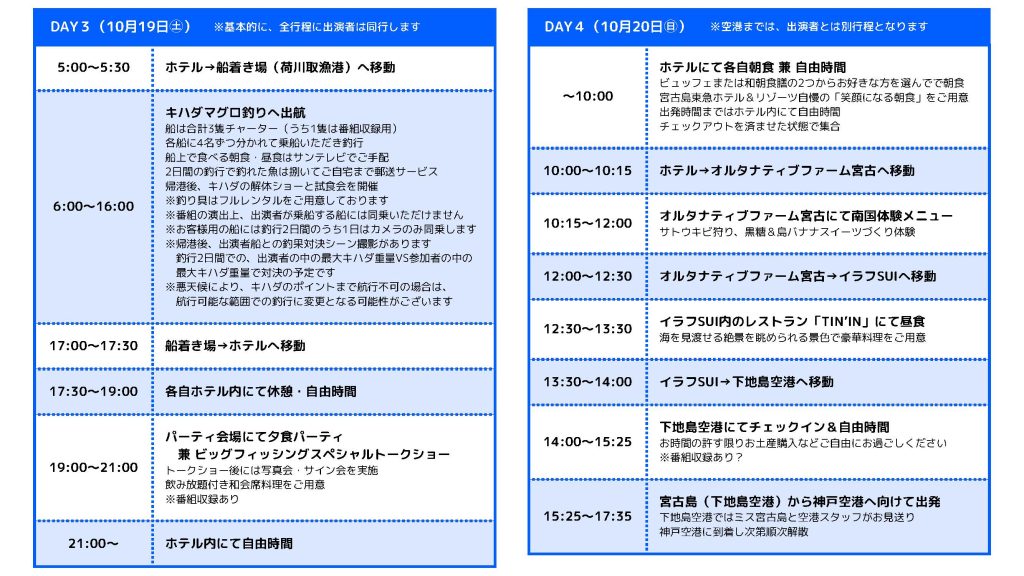 ビッグフィッシングメンバーと一緒に3泊4日で宮古島にキハダマグロを釣りに行きましょう!ビッグフィッシングの番組収録も行われるためツアーにご参加いただくと、漏れなく番組にも出演できます!なお、宮古島スペシャルは合計3週にわたって放送の予定です!