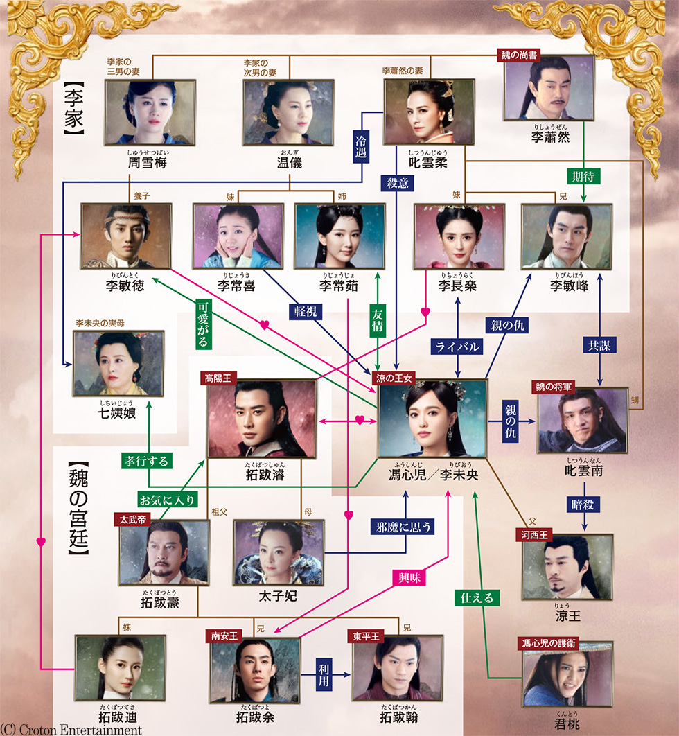 父と祖母を殺され、涼(りょう)の王族の血を残すため一人で生き延びる道を選ぶしかなかった馮心児(ふうしんじ)。彼女は行き倒れたところを優しい村の娘・李未央(りびおう)に救われる。実は李未央は尚書・李蕭然(りしょうぜん)の娘。母親が身分の低い侍女だったため村で不遇の生活を送っていたが、近々李家に戻れることになっていた。だが、李未央は突然刺客に襲われて…。