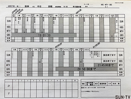 もう一つ複雑なのがCMの途中にネット局の中継が始まる場合です。90秒CMの途中でネット局向けに話をして、サンテレビのCMが明けるタイミングでポーズをとらないといけませんので、実況アナウンサーはもちろん、指示を出すFDも緊張の一瞬です。サンテレビだけでなく、ネット局での中継をご覧いただいている視聴者の方々に観やすい、聴きやすい中継をできるよう今後も心掛けていきます。