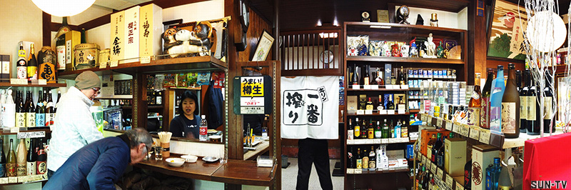 店を入ったところに立ち席のテーブルがあり、左手に缶詰やお客さんがキープした酒を保管している棚がる。その棚の奥には椅子の入ったテーブルがある。混んでいないときは、椅子ありテーブルに座るお客さんが多いようだが、最近では背の高いテーブル側でも椅子を利用するお客さんが増えた。春になればテーブル席から道路を隔てた先に現光寺の桜を見ることができる。酒は売るほどにあり、花見には最高のロケーションだ。