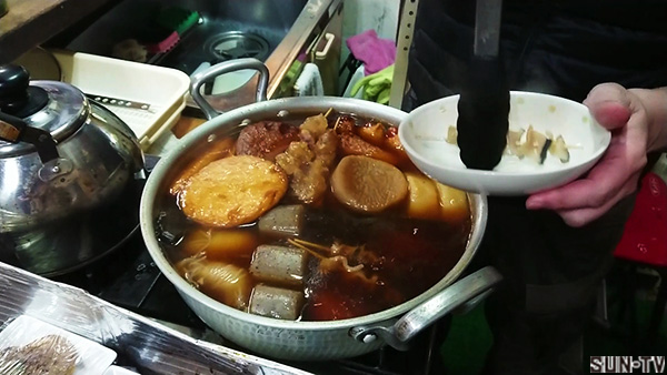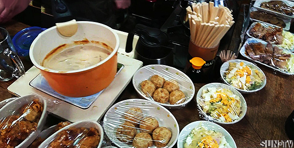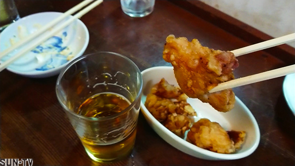 取材時にはワカメ、茎ワカメ煮、土筆のあえたもの、鶏のから揚げを出していただいた。酒が進む。カメラの福田さんは日本酒、筆者は宝の焼酎ハイボールを追加した。日本酒は保温器で温められているので燗をする必要がない。ところ変われば燗をする方法もさまざまである。