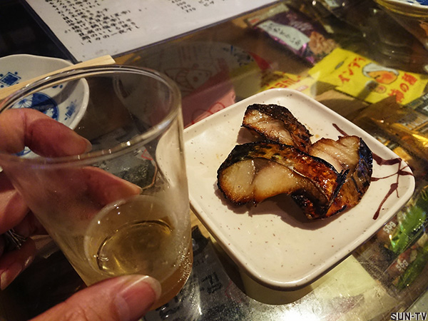 従来の角打ちスペースはキャシュオンデリバリーであるが、テーブル席の方は、後でまとめて支払えばいいとのこと。注文もお母さんが取りに来てくれるので利便性もいい。そこでよく出るという”鯖のいしる焼き”をオーダーした。しばらくして焼きあがったものが運ばれてきた。「ご飯か日本酒が欲しくなりますよ」と三好社長。確かにそんな味で美味しい。