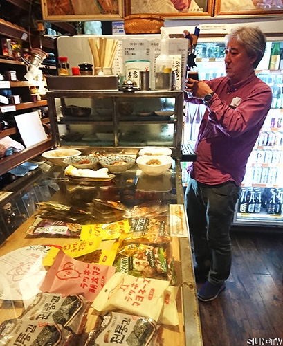 今回の訪問で気がついたのは、酒売り場に広めのテーブルが二つ置かれ、立ち飲みスペースができていたことである。まだ午後4時過ぎなのに、お客さんも増えてきたので冷蔵庫の上をカウンター代わりにして、まずは瓶ビールをもらって三好社長から話を聞いた。