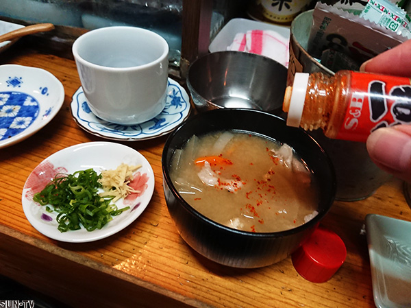 筆者はレモンサワー、福田さんは桜正宗の朱稀を追加し、最後に具沢山とん汁も。安いのでよく食べ、よく飲みました。