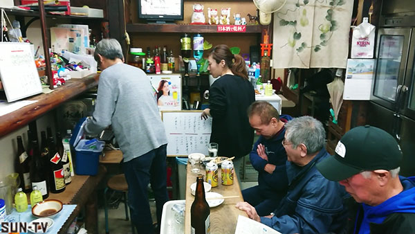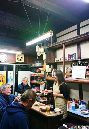 気がついてみるとお客さんは更に増え、男性客に混じって女性客も和気あいあいと楽しんでいるのが印象的だ。声を掛けていた久保町の事務所で働く知人女性も加わった。「仕事帰りにのぞくとお客さんが一杯で入りにくい気がした」そうだが、「これで明日から一人で来れるね」と囁いた。今回の筆者らのような一見にも常連さんはとても親切に接してくれた。