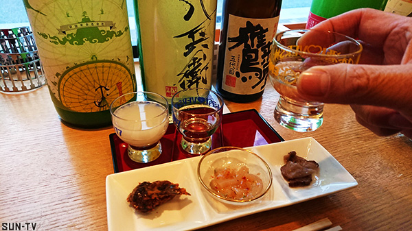 午後4時半に入店したものの、お客さんはまだ見えない。我慢できないカメラの福田さんが”飲み比べ+おつまみセット”を注文したので、筆者も安易に同じものを選んだ。酒3種は奥様におまかせで選んでもらった。2人分で6本の瓶がカウンターに並んだ。