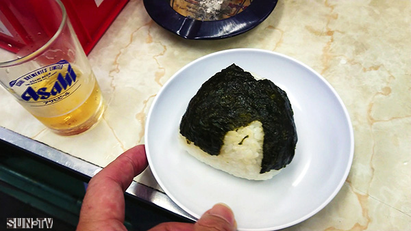 瓶ビールは店の方が出してくれるが、壁際にある冷蔵庫に入っているアテや缶ビール、日本酒は自分で取って店の方に申告するシステムだ。知らないことは常連さんに聞けば親切に教えてくれる、楽しいひとときだった。ナガイ米穀店の看板もあり、店で精米した”おにぎり”が格別うまかった。