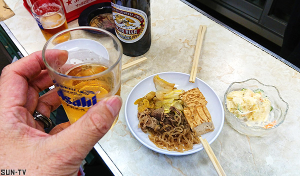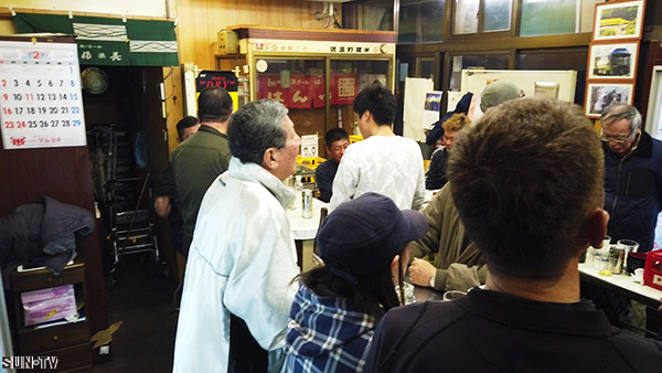 入店したのは午後4時半だがすでに満席に近い状態で、空いていたテーブルの一つに席を取った。まずは麒麟ビールで乾杯だ。アテには筆者はあの”おにぎり”、カメラの福田さんは”すき焼き風の煮込み”、友人は”ポテサラ”を選んだ。その後、次々と仕事帰りのお客さんが増えていき、ちょっとしたダーク状態である。
