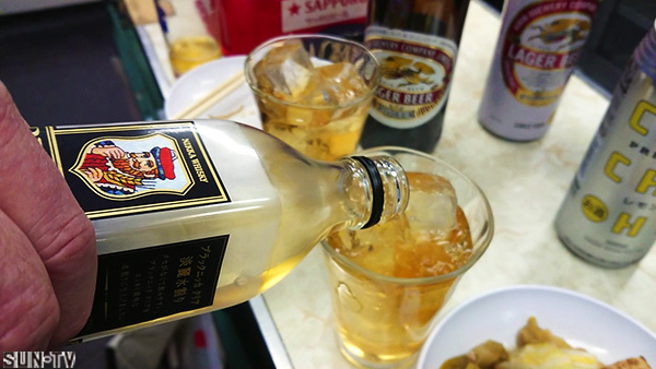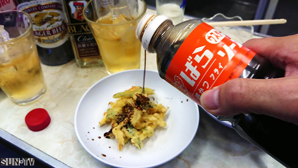 ビールが空になったので髭のウイスキー、ブラックニッカ水割りを冷蔵庫から取って店の方に自己申告する。すると氷がたっぷり入ったグラスを2つ運んでくれた。ありがたいシステムだ。カウンターに並んでいる手作りのアテから”かき揚げ”を追加。