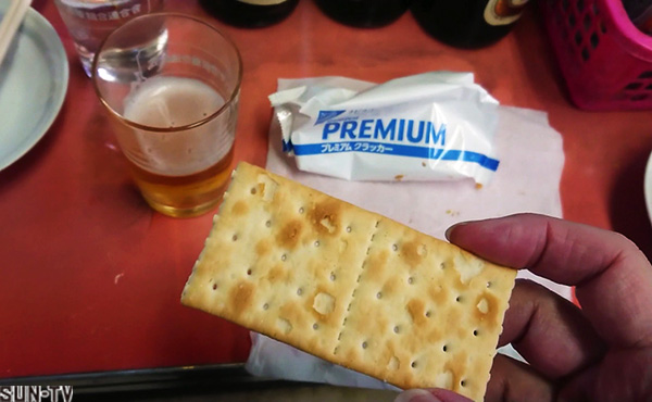 熱燗を追加した。燗をする道具や方法も店によって様々であるが、ここ材木酒店は電子レンジを利用する。200ccのコップに八分目くらい入れて、チンしたあと残りを追加して飲み易い温度に調整するのである。酒は西宮郷の白鹿だった。美味である。アテはナビスコプレミアムクラッカーやしゅうまい、おでんなどをもらったが、何を注文してもお客さんとの会話がアテになる。