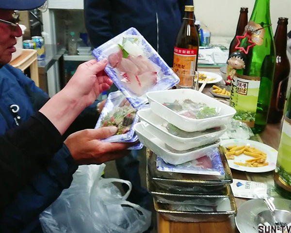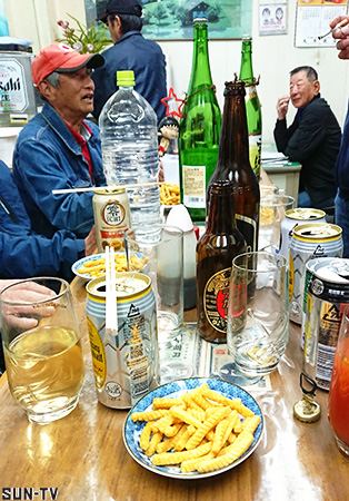 気が付けば閉店の時間である。帰り支度をしていると一人の女性客が「魚屋さんが刺し身持ってくるよ」と言う。しばし待機すると魚屋さんがパックに入れた魚をテーブルに並べてくれた。鯛、ハマチ、イカ、マグロが入ったパックがなんと200円ということで一つ買わせていただいた。持ち帰ってから熱燗でもう一杯飲んだことは言うまでもない。