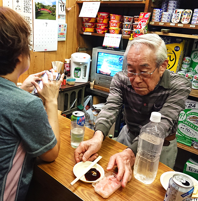 この時間に立ち飲みができるとは、うれしいものがある。美人の女将さんと娘さんが快く向かえてくれた。燗酒と雲丹くらげをもらい、ゆっくりと味わいながら店のことを伺った。