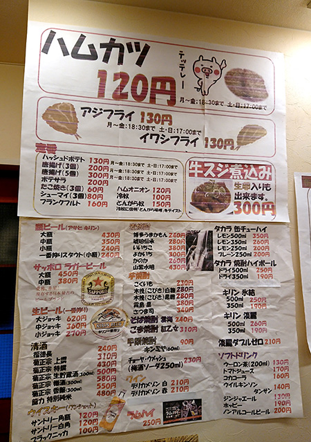 店内はカウンターの他に、いくつかのテーブルがあり十分広く、「飲むほどにDRY辛口、生。」のアサヒビールポスターを見るにつけ、昭和の香りがまだ残っていた。アテは乾き物か練り物が主体ではあるが、立ち飲み価格表には、ビール、ウィスキー、焼酎、ワインときめ細かく書かれており、店主の律義さが滲み出ている。十余年を経た今も、お互い歳を重ねた以外は何も変わってはいない。
