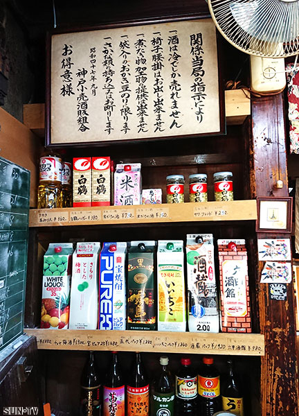 原酒店を出て、もう1軒、大開通にある西脇商店に寄ることにする。JR兵庫駅から北へ、あるいは神戸高速大開駅から南に下ると角打ちの原点と呼ぶにふさわしい西脇商店がある。後述の理由により看板がないので通りすぎるかも知れない。