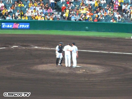 福原の名前がコールされ、金本監督が自らマウンドに上がってボールを手渡した。