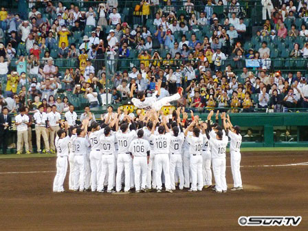 あとを継いだのは安藤。先発、リリーフ…現役生活の長い時間、優勝もしたけど、ひどい野次を受けるような辛い時間も共にした。お互い抱き合いたいのを堪えたか、背中と胸を叩いて、福原はマウンドを降りた。
