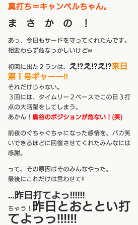この日記なんですけどね、文字が大きくなったり小さくなったり色がついたりしてるんですけどね、これ、私がやってるんじゃなくて、日記を私からメールで受け取ったサンテレビのクロスメディア推進部っていうところの私担当の(かわいそうな)MさんYさんが、作業して更新してくれてるんですよ。