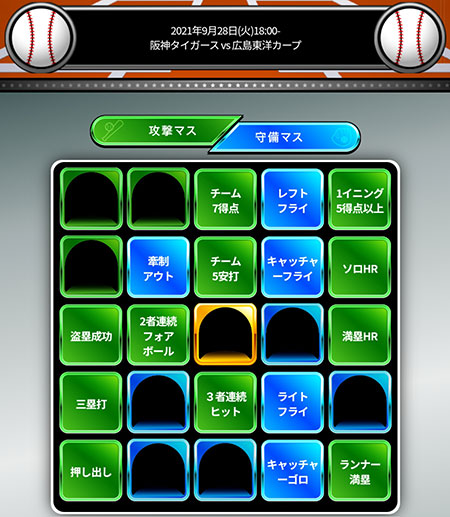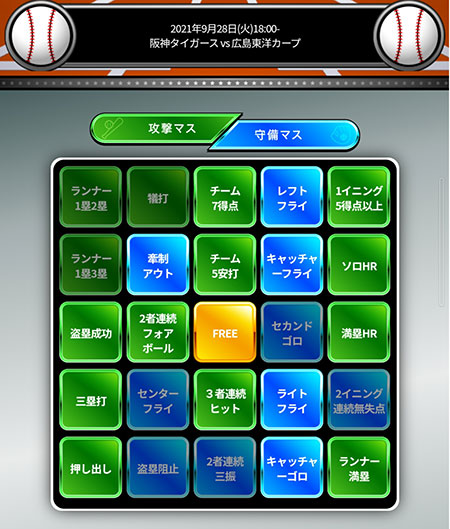 応援するチームをタイガースかカープか決めて参加すると、ランダムにビンゴカードが配付されて、カードにあるプレーが実際の試合で出て並ぶとビンゴ。