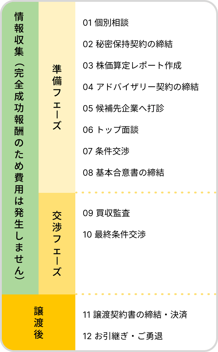 M&A業界で豊富な実績を持つ最高峰のアドバイザーが、ご相談から成約まで一貫してサポートします。
