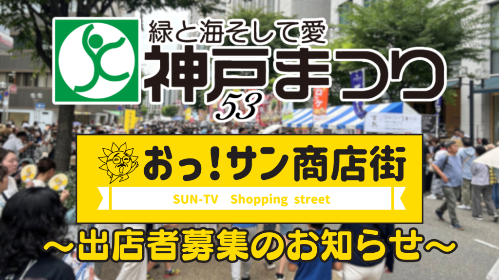 神戸・三宮で毎年開催される「神戸まつり」において、サンテレビではグルメや体験のブースが並ぶ「おっ!サン商店街」を展開し、会場を盛り上げています。第53回となる今年は、より多くの来場者の皆さまに楽しんでいただけるよう、下記の要領に基づいた出店ブースを募集いたします。