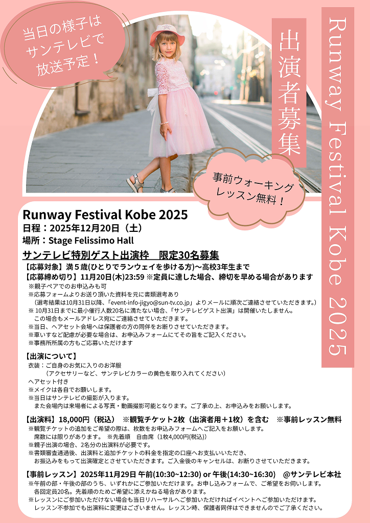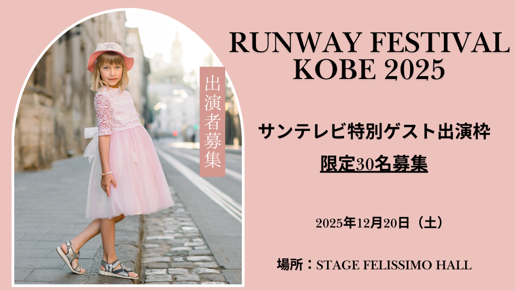 「Runway Festival Kobe 2025 サンテレビ出演枠」開催決定に伴い、募集期間を11月20日まで延長いたします。10月31日までにご応募いただいた方には、11月上旬より合否のご連絡をお送りいたします。