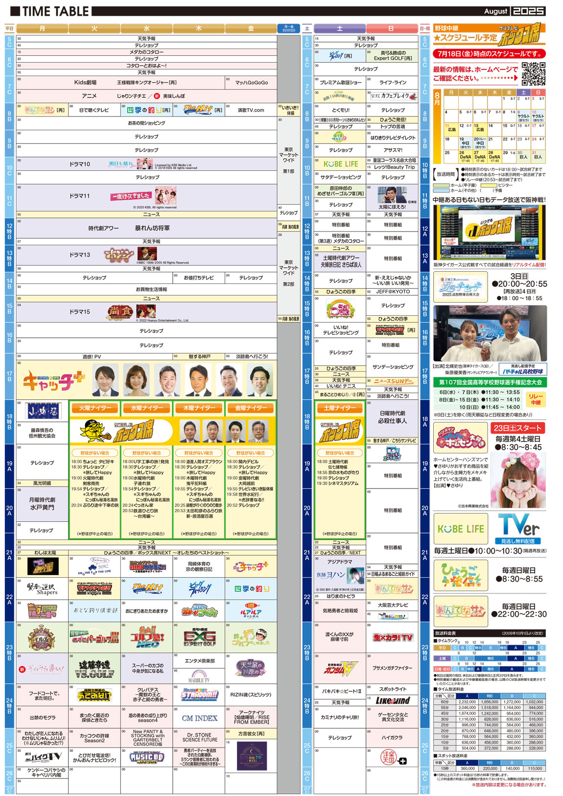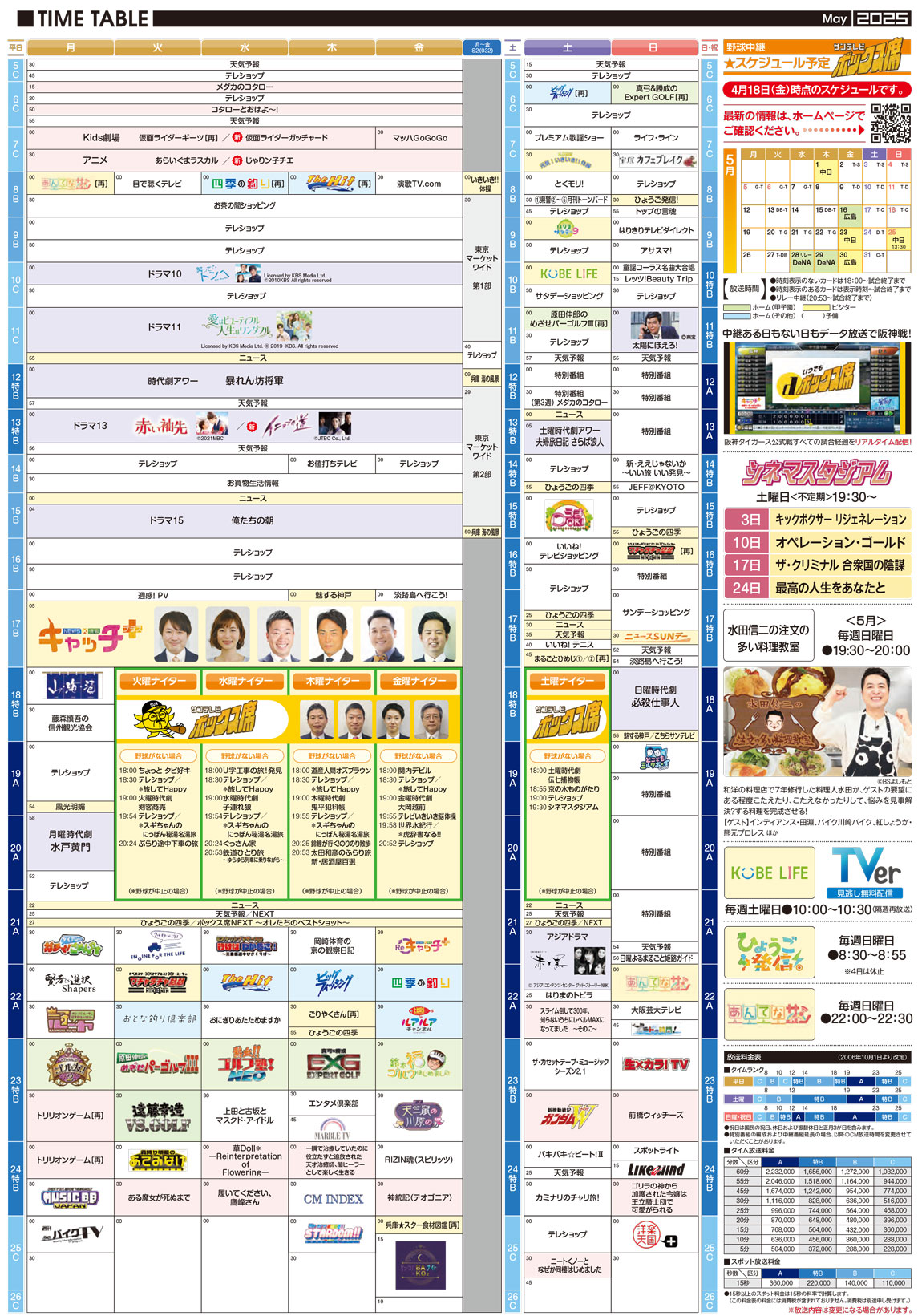 タイムテーブルをご希望の方は、110円切手を貼った返信用封筒[長型3号](1部の場合)に、住所、氏名、郵便番号をご明記のうえ、下記宛先までお送りください。 (複数お送りする場合は切手のお値段が変わりますのでお問い合わせください) ※毎月25日頃発行。数に限りがございますので、終了の場合はご了承ください。 〒650-8536 サンテレビ タイムテーブル希望係
