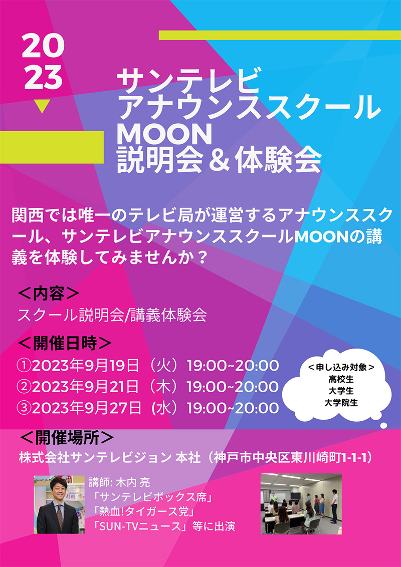 サンテレビアナウンススクールMOON運営事務局 (※サンテレビジョン事業部内) Tel: 078-361-0305