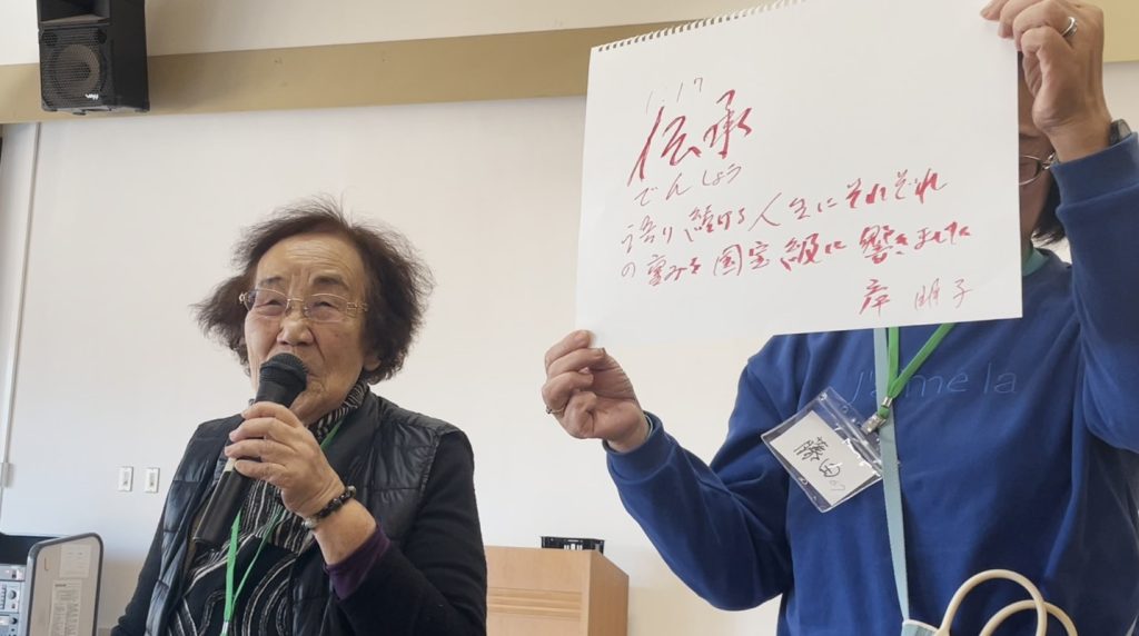 震災の記憶や教訓を若い世代に伝えようと、神戸市北区で行われた震災伝承合宿に初めて参加した94歳の岸明子さん。31年前、地域の民生委員として住民たちの安否確認に奔走した。避難所での助け合いや、誤認されて連れていかれた遺体を民生委員として取り返しに行った話など、手記をもとに、当時の記憶を辿った。