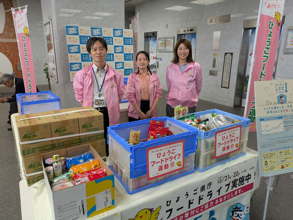 2025年10月21日(火)「ひょうごSDGs月間」の一環として実施された「ひょうごフードドライブ」と連携し、24品3,555グラムの寄贈を行いました。この模様を10月27日(月)「キャッチ+」で紹介し、フードドライブへの参加を呼びかけました。家庭で余っている食品をごみにせず、それを必要とする福祉団体等にスーパー等を通じて寄附する「フードドライブ」は、食品ロス削減を図る一つの手段となり、県民一人一人が取り組むことができる活動です。兵庫県では、このフードドライブの活動を、「ひょうごフードドライブ推進ネットワーク」(関係団体、スーパー、市町、県等で構成)が中心となって、「ひょうごフードドライブ」として全県展開を図っています。