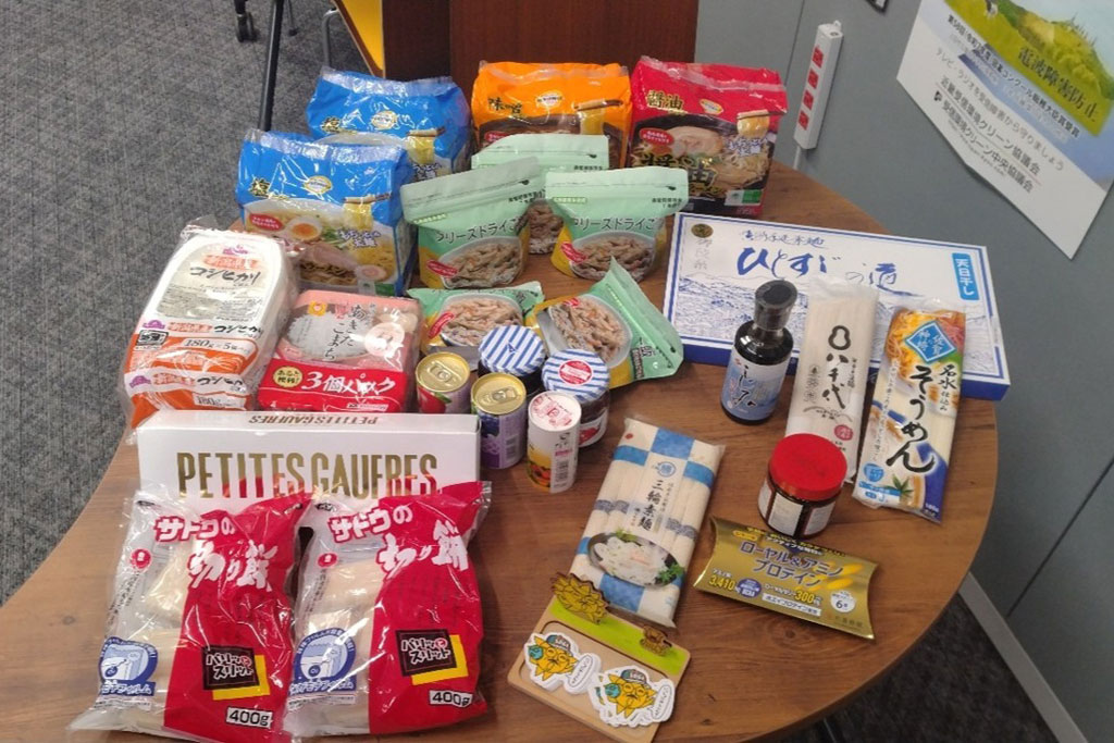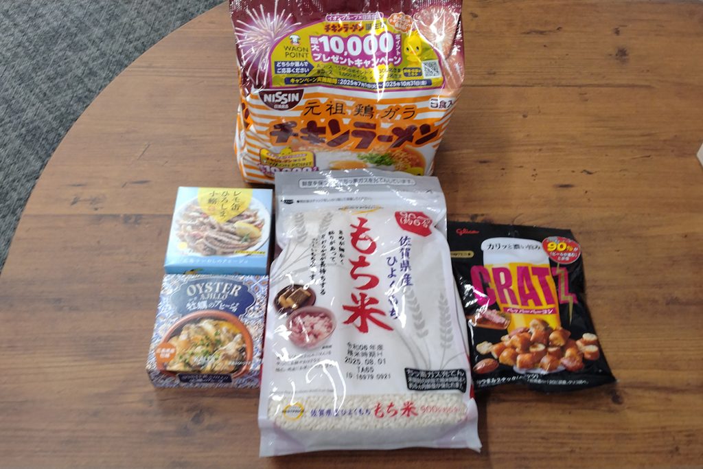 缶詰、レトルト食品、インスタント食品、調味料、素麺などの乾麺、米、お菓子、のり など