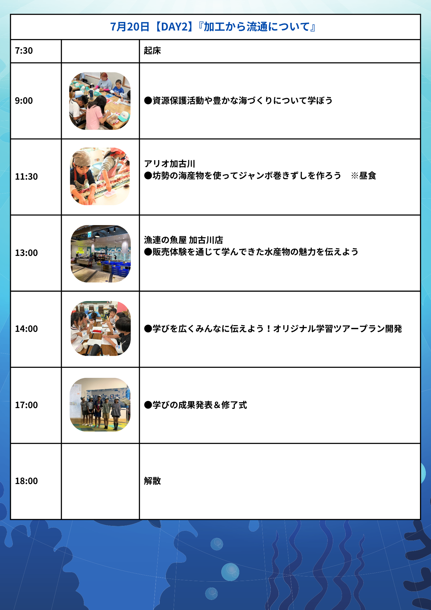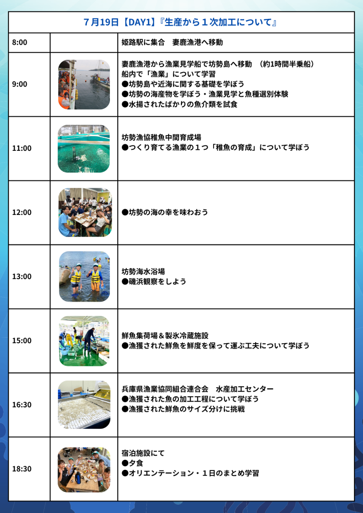 地域の漁業や水産業の魅力を体験する1泊2日のツアーを実施します。姫路市・加古川市を舞台に水産業に携わるプロと連携し、地域の海や魚、水産業と自分との繋がりを意識することができる様々なプログラムを体験していただき、持続可能な漁業や豊かな海づくりについて一緒に考えていきます。