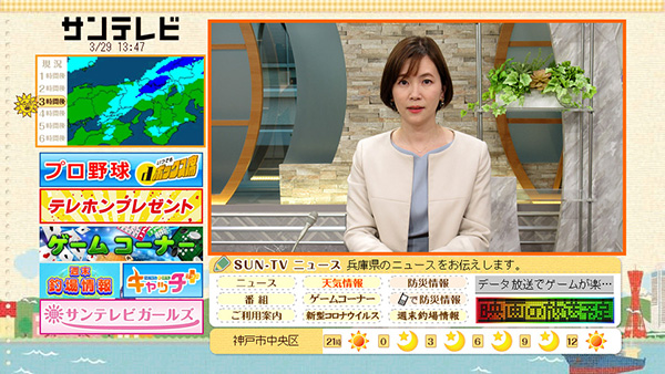 リモコンのdボタンを押すと10日間予報や雨雲レーダーがひと目でわかる詳細な天気予報がお役に立ちます。 楽しく遊べる「ゲームコーナー」のほか、兵庫の感染症関連情報も随時掲載します。 また、台風や大雨、洪水などで発表される警報や注意報、緊急安全確保などの災害情報は、データ放送でも24時間お伝えしています。