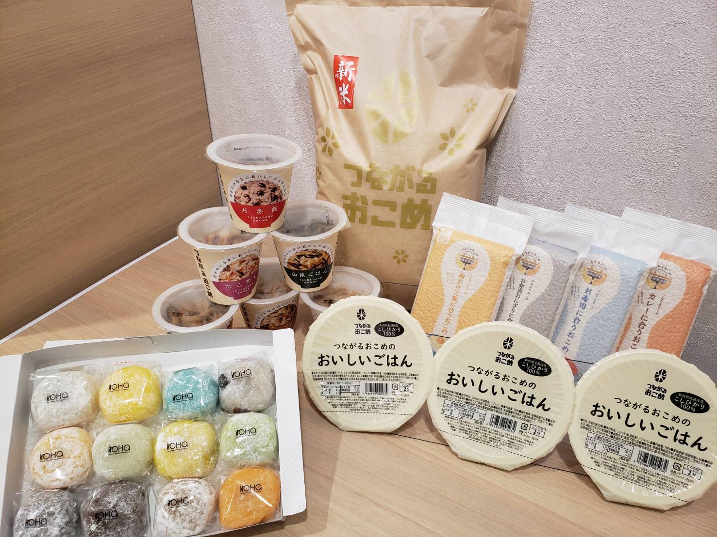 また、「真空パック米」や電子レンジで温めるだけの「カップ炊込みご飯」、滋賀県産羽二重モチを使用した30種類のフレーバーがあるカラフルな「大福」など、お米に関わるオリジナル商品が多数取り揃えられており、老若男女問わず楽しめるお店となっています。
