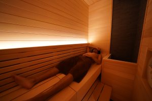 サウナ室、シャワー室、外気浴のスペースは、すべて完全個室。個室内には、充実したアメニティに加え、ドリンクの注文などもモバイルオーダーができ、プライベートが守られる仕様。サウナ室内は、横になれるように幅2.2メートルのこだわり設計。室温は80~100度で調整でき、セルフロウリュも自分の好きなタイミングで楽しめます。