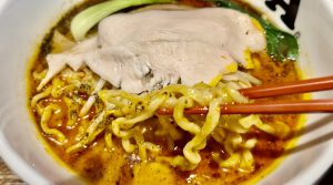 スープは鶏ガラベースにサバ節、昆布、煮干しで取っただしの味わいがミックス。さらに、ゴマとローストしたクルミの香ばしが加わりクリーミな味わい。中細のちぢれ麺とよく絡み唐辛子と山椒のスパイスで「痺れ」と「辛さ」の刺激が心地よく広がります。