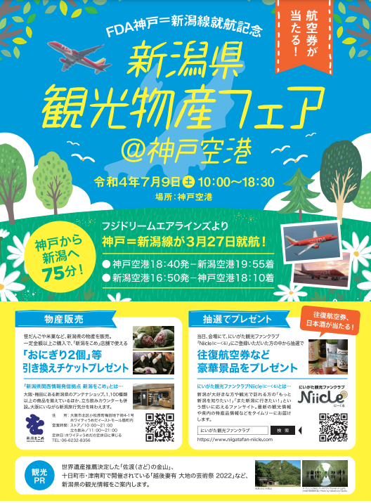 この就航を記念して、7月9日(土)に神戸空港内で新潟県の観光物産フェアが開催されます。当日会場では、「往復航空券」「新潟の日本酒」など豪華景品が当たるキャンペーン等も実施されます。
