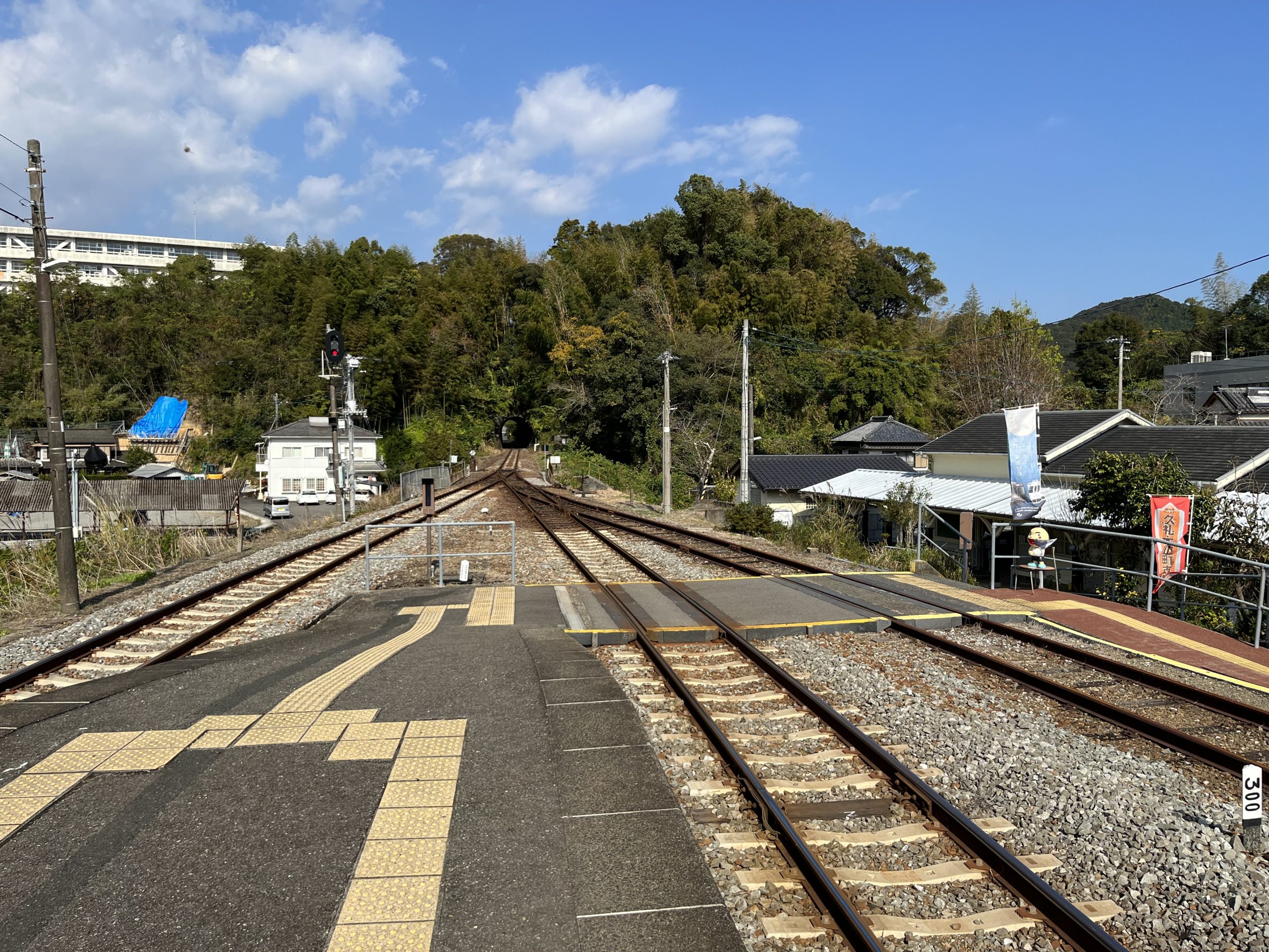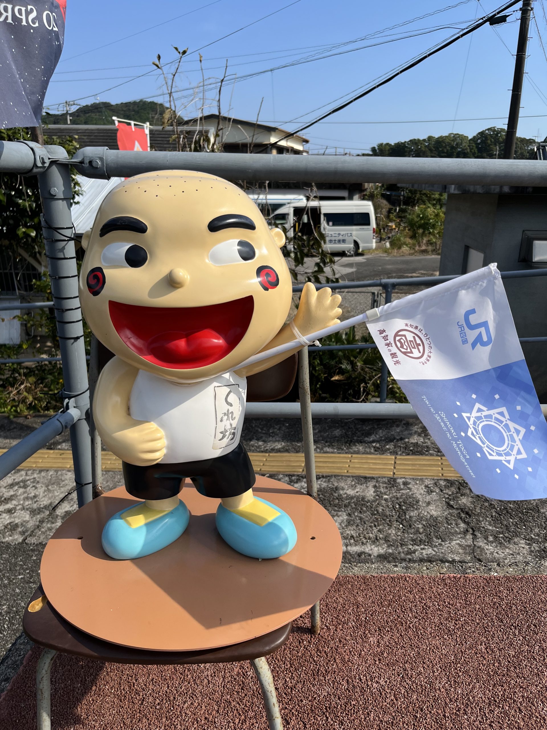 約50分で土佐久礼駅に到着。両サイドをトンネルに挟まれた土佐久礼駅のホームでは、久礼のキャラクター「くれ坊」がお出迎えしてくれます。