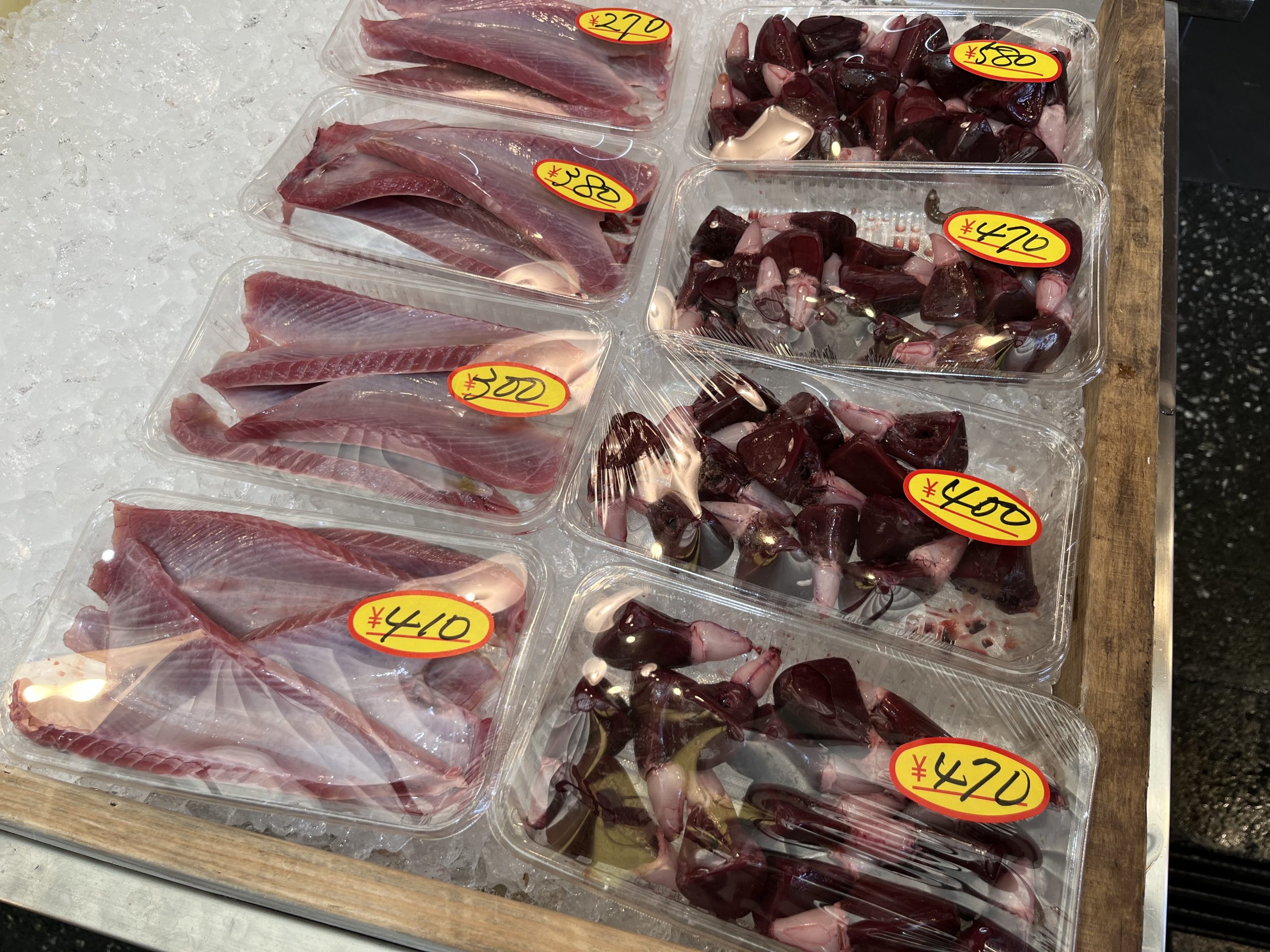背中側の「背節」、腹側の「腹節」、カツオの心臓「チチコ」やマグロでは大トロとなるお腹の部位「ハランボ」などがズラリと並んでいます。