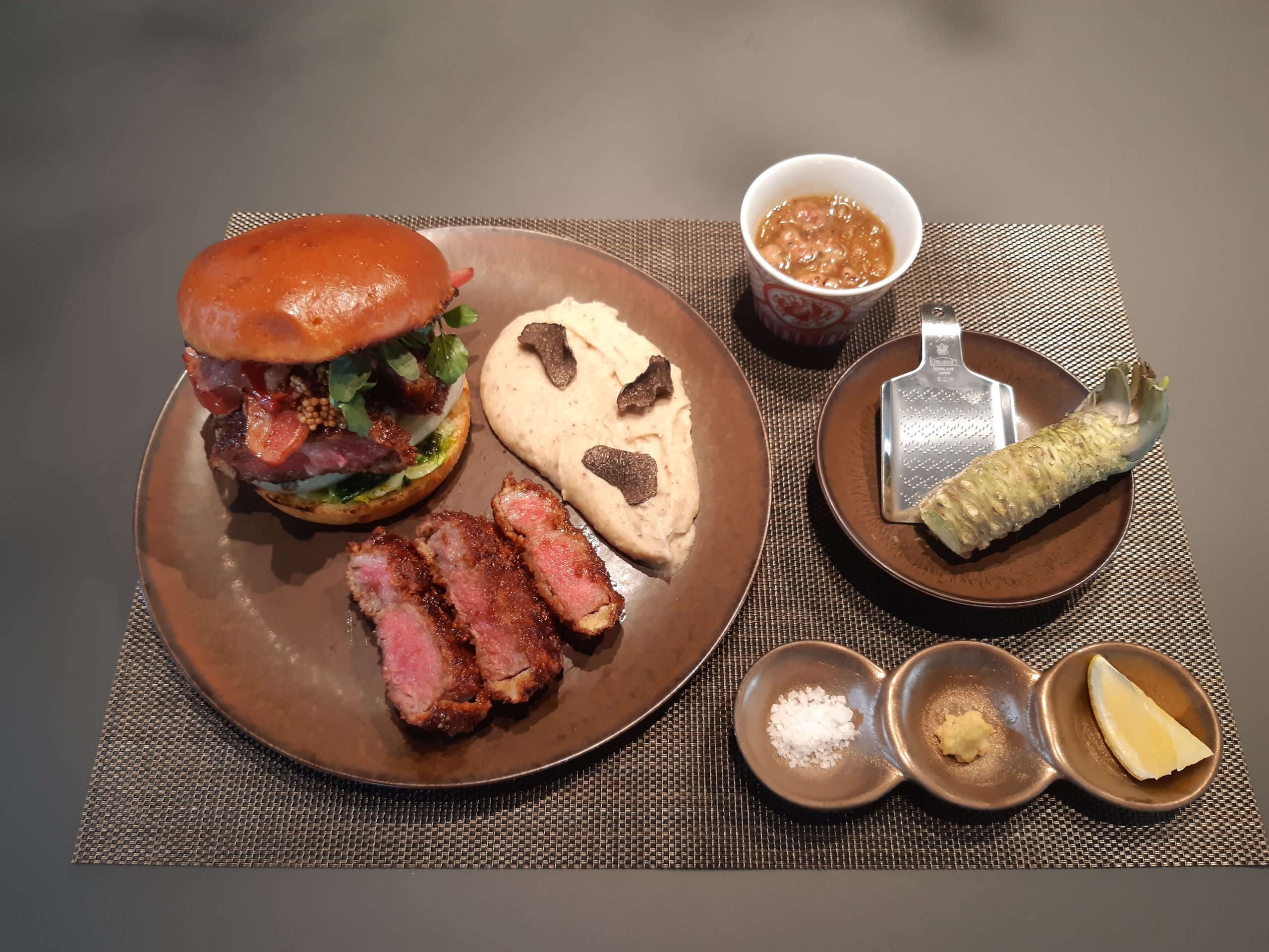 また、肉料理との組み合わせに定番のオニオンスープが脇を固めます。 さらに、肉をさまざまに楽しめるように、赤穂の塩、レモン、本わさび1本が用意されています。
